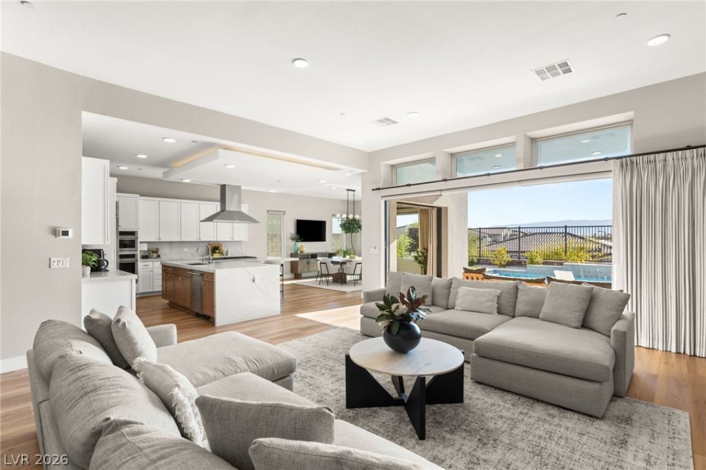 Experience luxury living at the peak of Redpoint Village! This stunning single-story home offers incredible alfresco living with custom features throughout. A stacked stone exterior with glass garage doors welcomes you into a spacious courtyard entry. Step through your glass pivot door into a massive open concept living area, flooded with natural light. You'll love the blonde plank flooring, double pocket sliders, slab calcutta counters, soft close white cabinetry, full beverage bar and elegant fireplace. Den has custom built-ins, flanking two oversized bedrooms with spa-like bathroom featuring floor to ceiling deco tile. Primary bedroom has an enormous shower with split vanities, spacious walk-in closets with direct access to your laundry room. Relax under your covered patio elevated above a paseo below with stunning mountain views. Pool has water fall features, spa, turf and thoughtful landscape throughout. Minutes from Downtown Summerlin, Grand Park, Redrock and more!