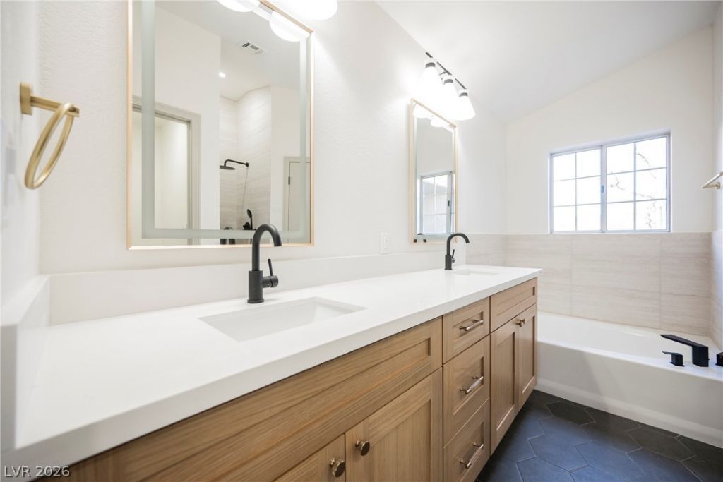 Elevate your expectations in an exquisitely upgraded 4 bedroom residence situated in west Las Vegas. Upon arrival gaze over remarkable xeriscape landscape complimented by inviting paint tones and extended driveway at the end of a culdesac. Awaiting you inside is a beautifully updated interior adorned with premium flooring, fresh millwork and a lovingly curated fixture package featuring brass lighting and knurled hardware. The island style kitchen is a true delight showcasing rich two tone cabinetry that's anchored down by gorgeous quartz counters, and stainless steel appliances. Retreat to a 1st floor primary suite paired with an en-suite equipped with a walk in shower finished in bespoke tile. Enjoy entertaining outback with a huge covered patio, synthetic grass and a fully fenced in yard. Schedule your private showing today!