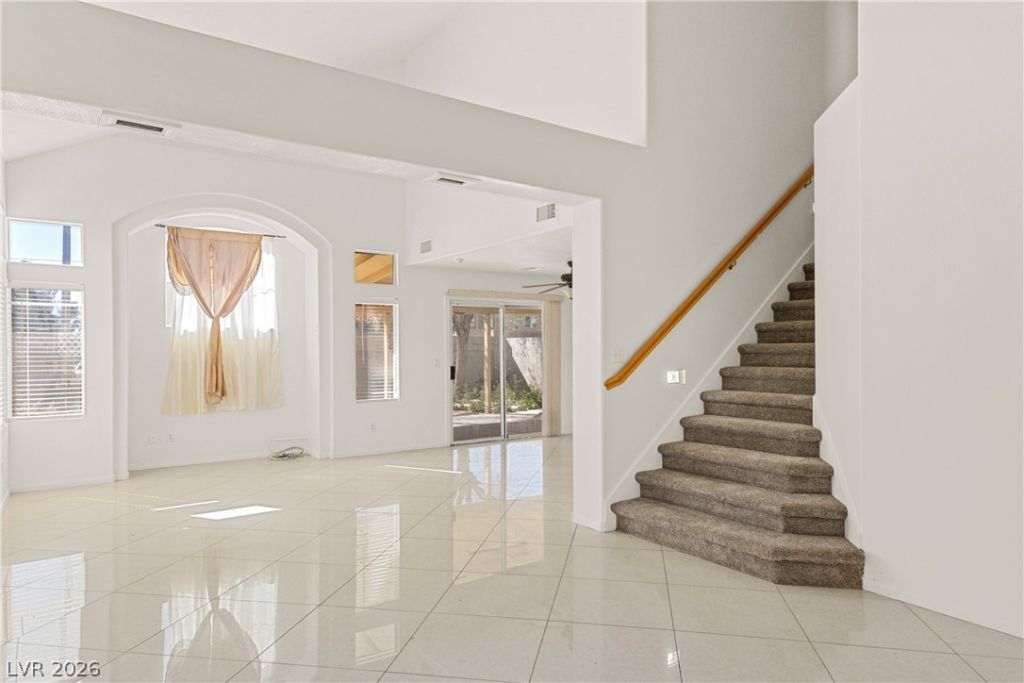 Welcome to this beautiful 3-bedroom, 2.5-bathroom home located in a desirable Las Vegas neighborhood. Thoughtfully designed for comfort and style, this home features ceramic tile flooring throughout the downstairs living areas, creating a clean and modern feel, while warm wood flooring upstairs adds character and charm. The inviting kitchen offers granite countertops, stainless steel appliances, and a convenient breakfast bar that opens to the main living space?perfect for casual dining, entertaining, or gathering with family and friends. Natural light fills the home, enhanced by window blinds throughout and ceiling fans that provide year-round comfort. Upstairs, the bedrooms offer a peaceful retreat with plenty of space and stylish wood flooring. The functional layout makes this home both comfortable and practical for everyday living. Step outside to the covered patio, ideal for relaxing or enjoying outdoor dining in the Las Vegas evenings.