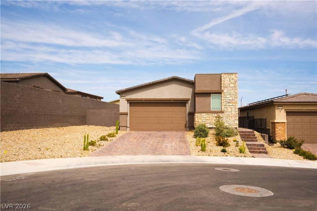 Beautifully upgraded single-story Lennar Nex-Gen home in gated Sunstone at Skye Canyon. Located at the end of a private cul-de-sac with no direct front-facing neighbors and a park-like walking trail across the street, offering added privacy and a serene setting. Flexible Nex-Gen layout ideal for multi-generational living or guests. The main home features an open layout with wood-look tile flooring, spacious living area, and a modern kitchen with quartz countertops, stainless steel appliances, and large island. Larger lot with backyard not yet landscaped?ready for your personal design and finishing touches. Solar for energy efficiency; buyer to cooperate with solar concierge and assume lease/transfer (buyer to verify). Move-in ready with access to parks, trails, and community amenities.